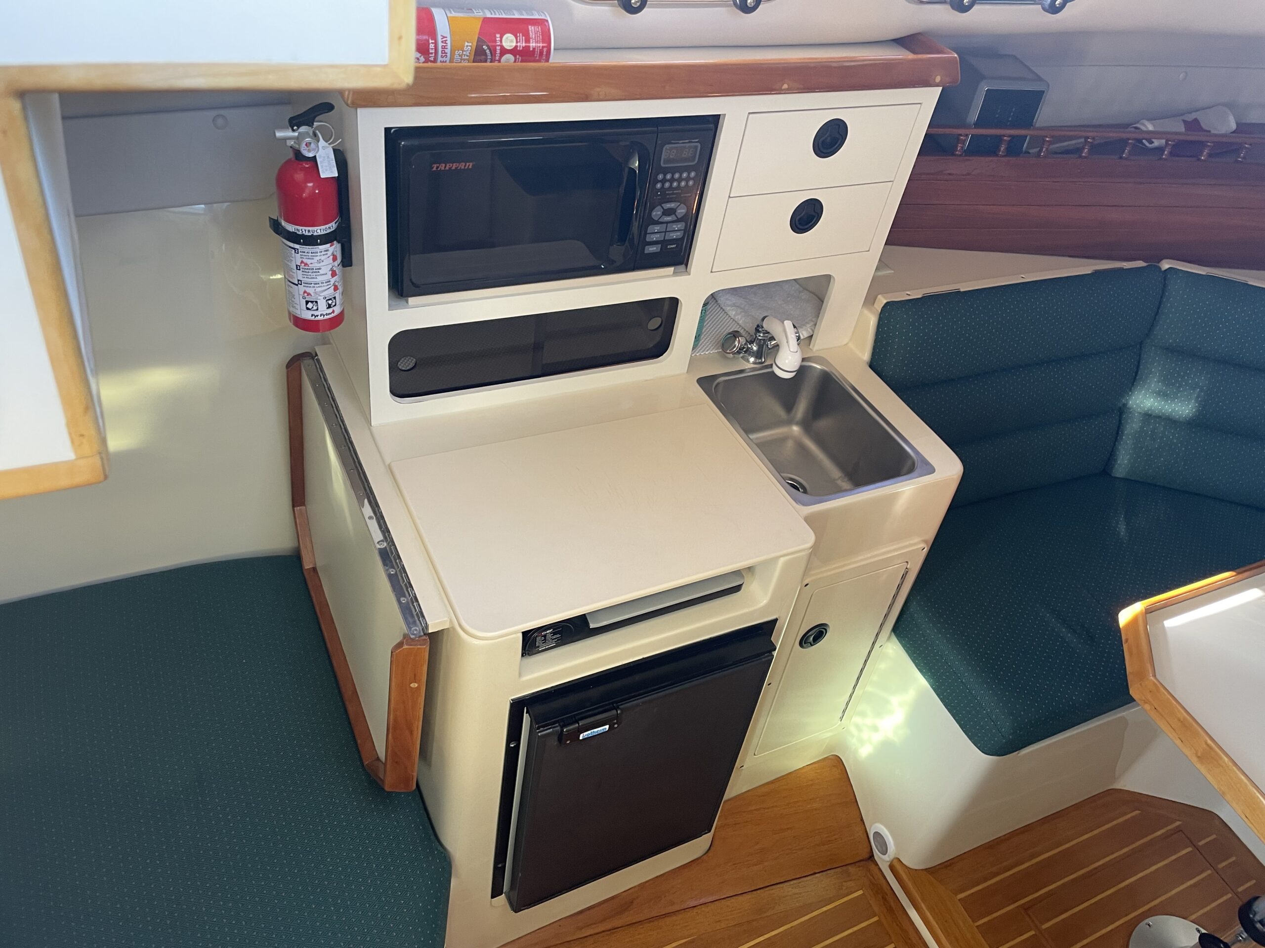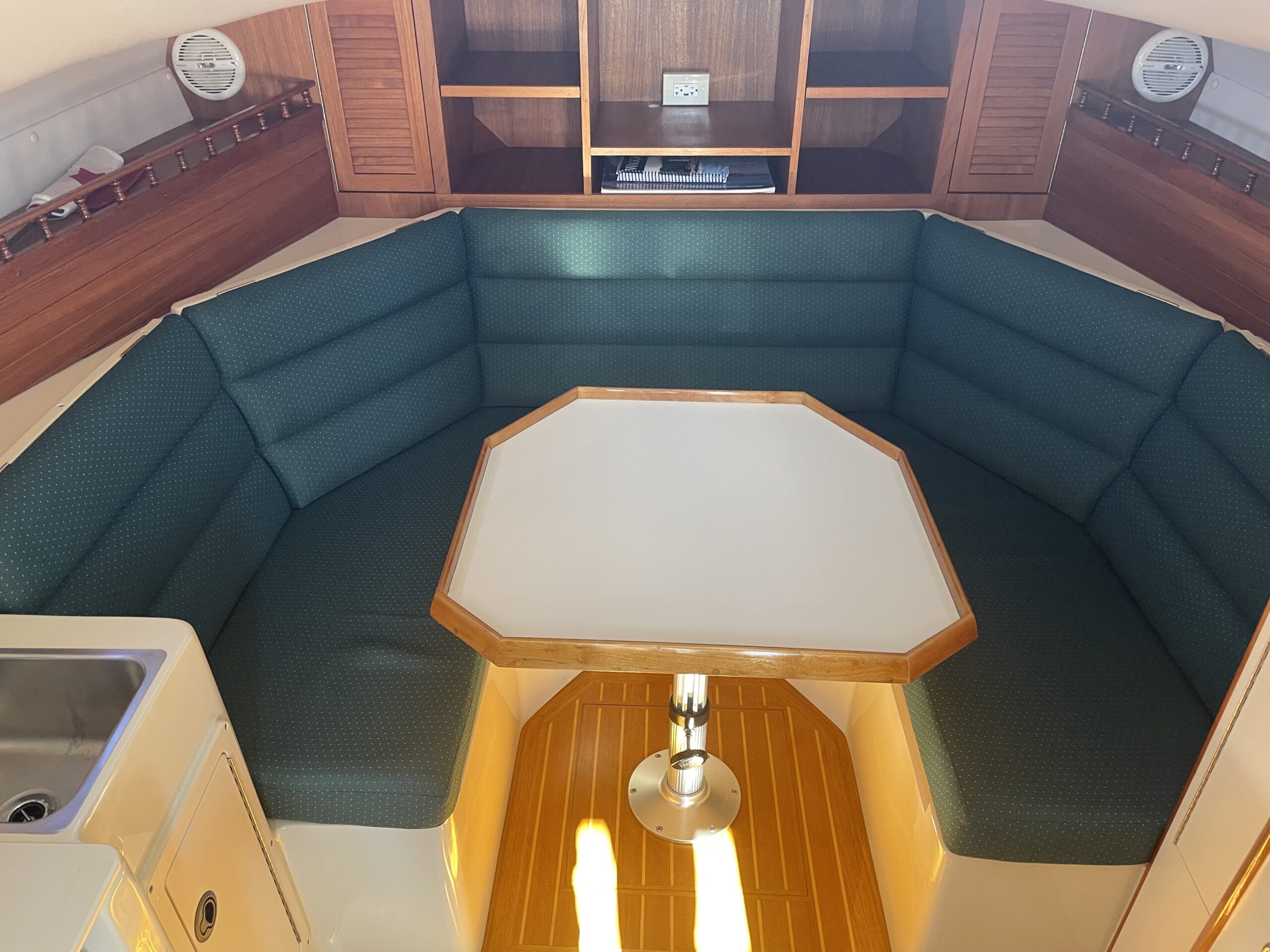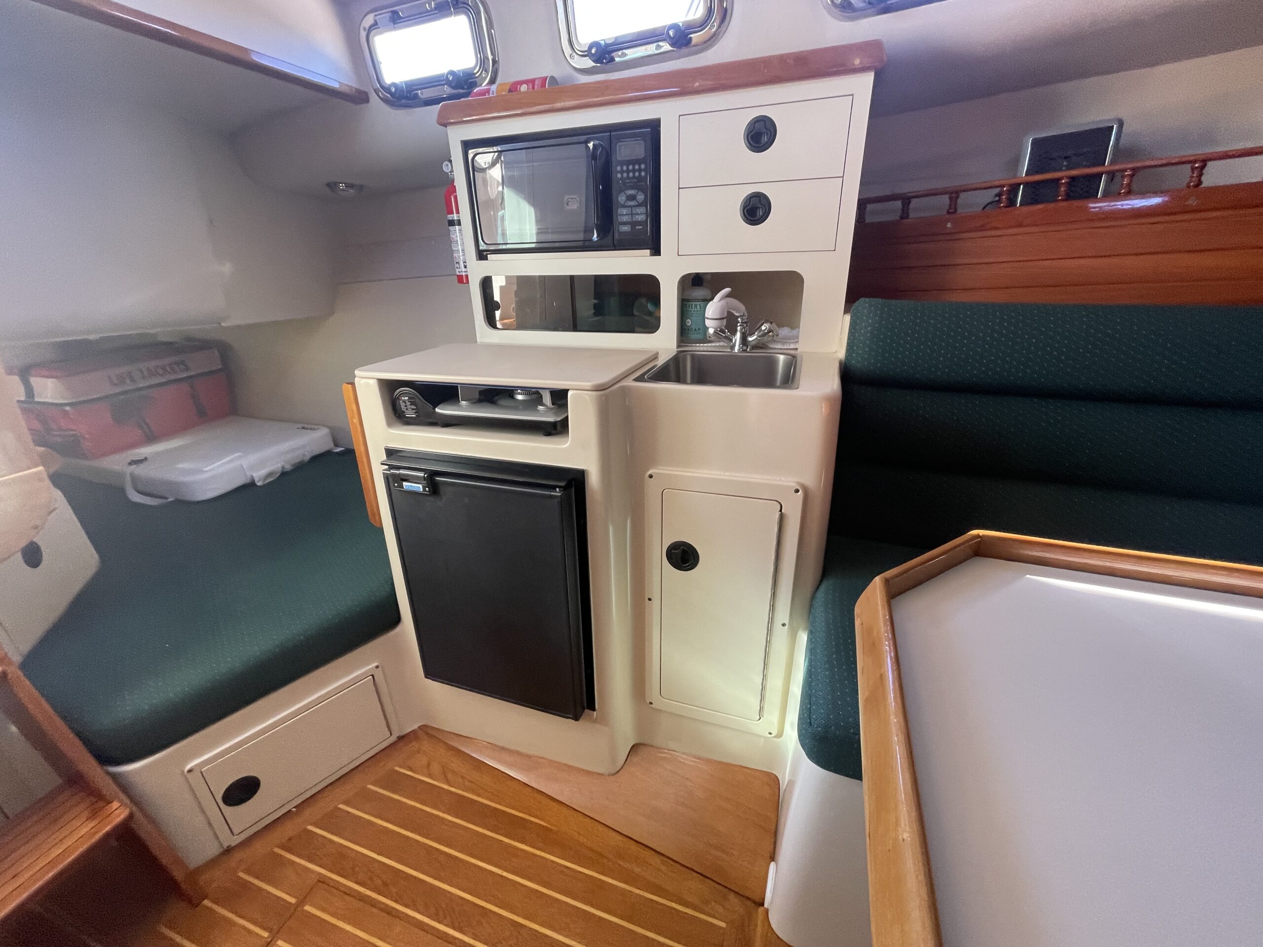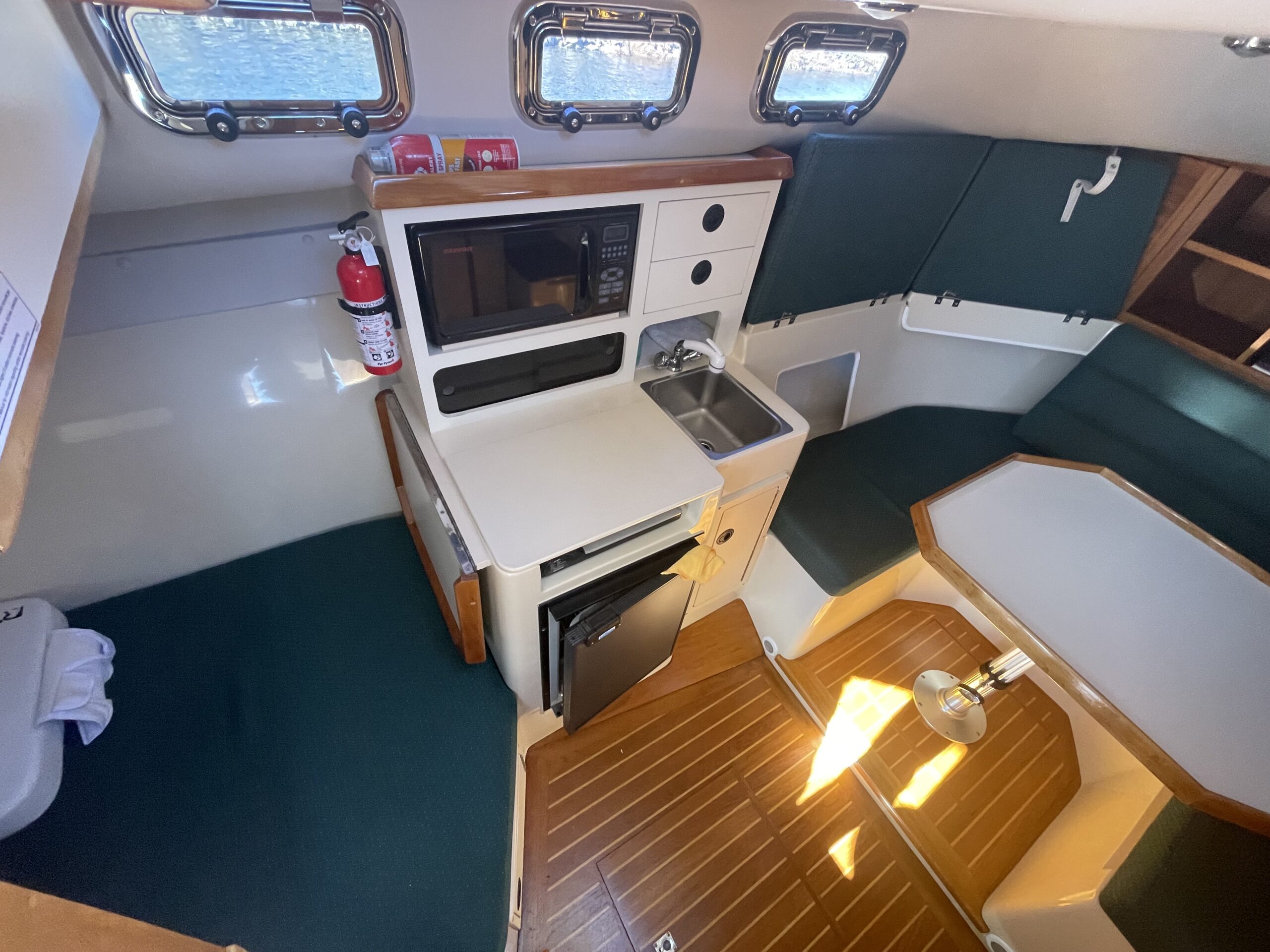 full-service galley with fridge & microwave, stand-up head/shower, mid cabin berth aft & a convertible U-shaped dinette forward. Six opening ports provide good cabin ventilation.