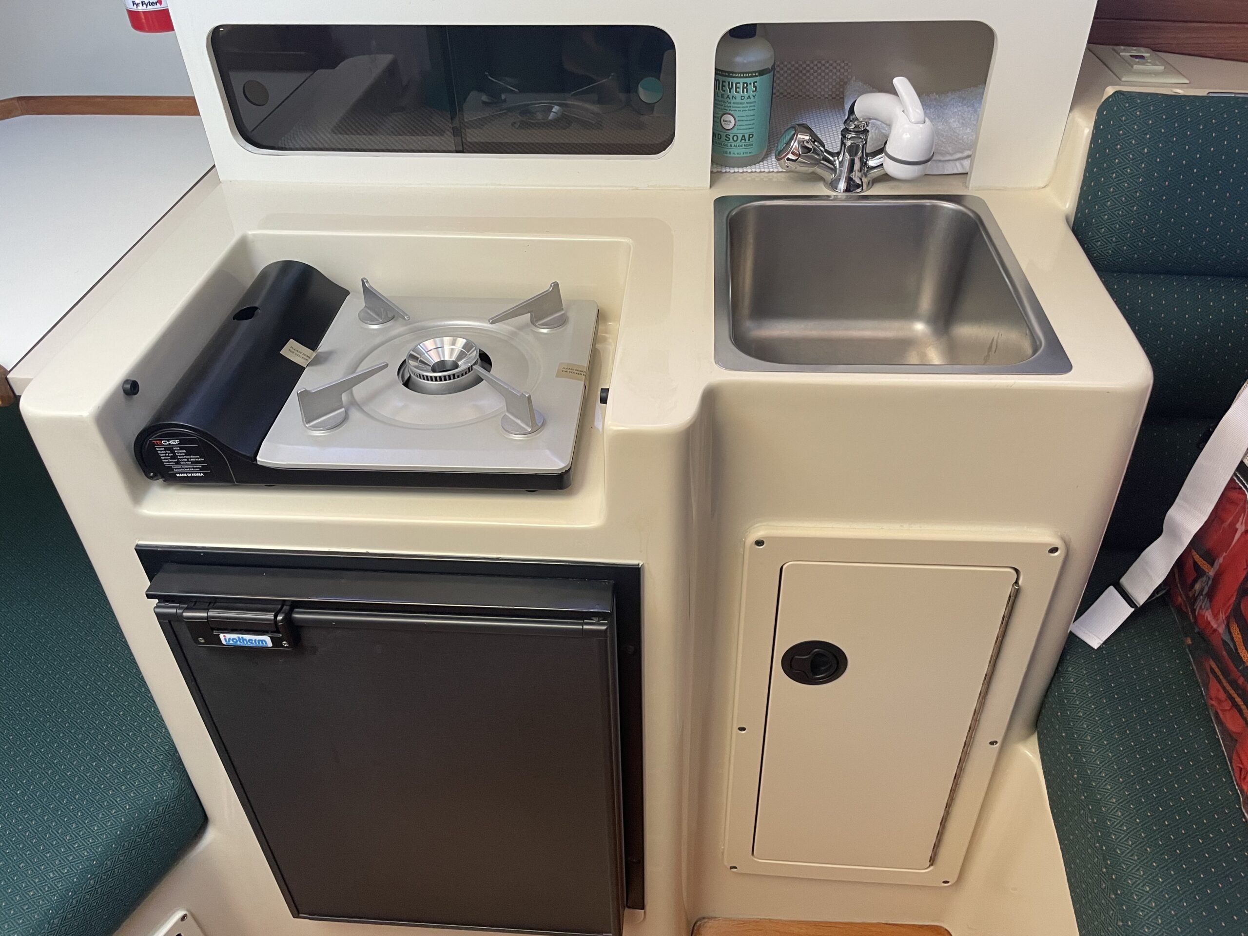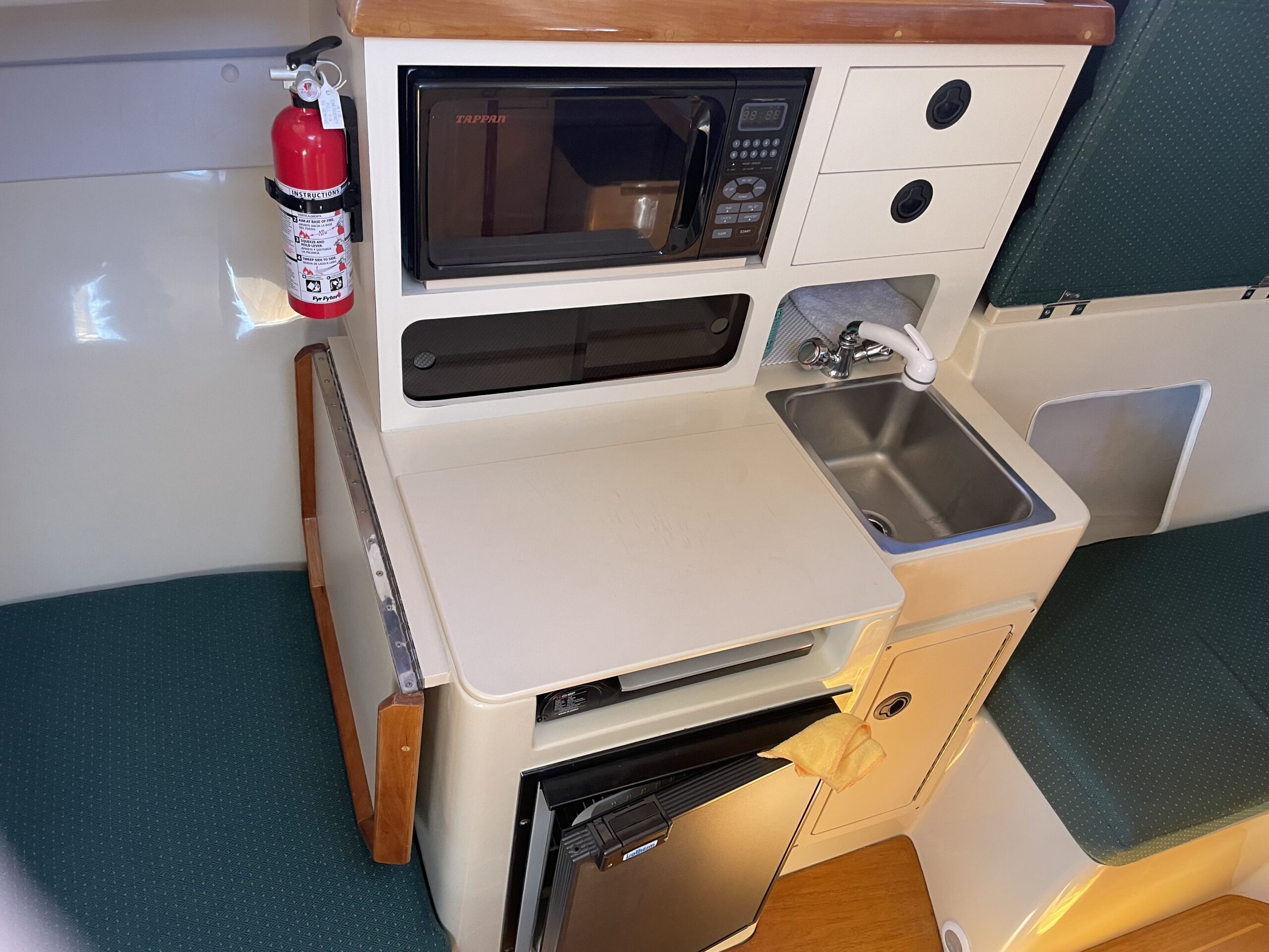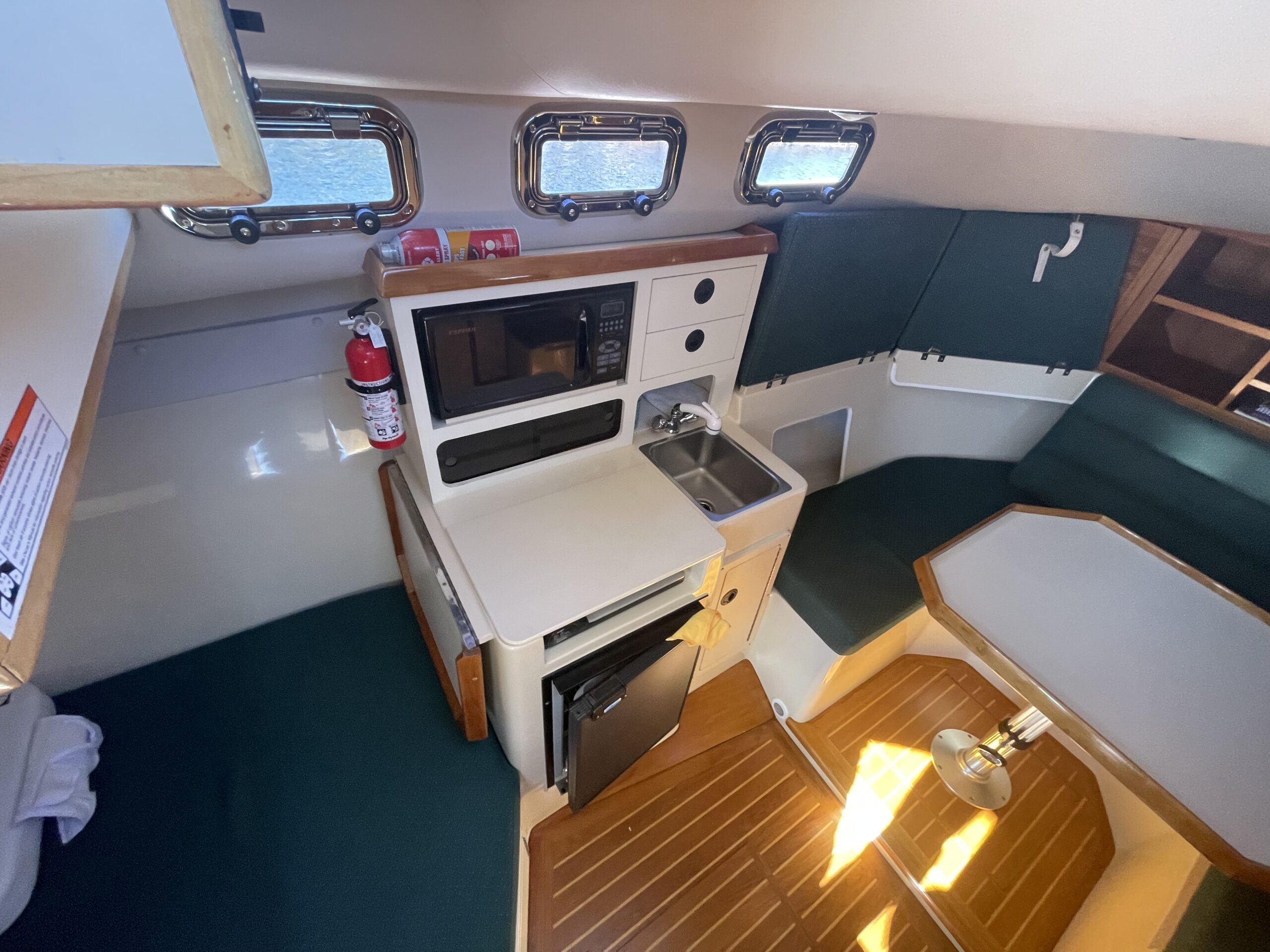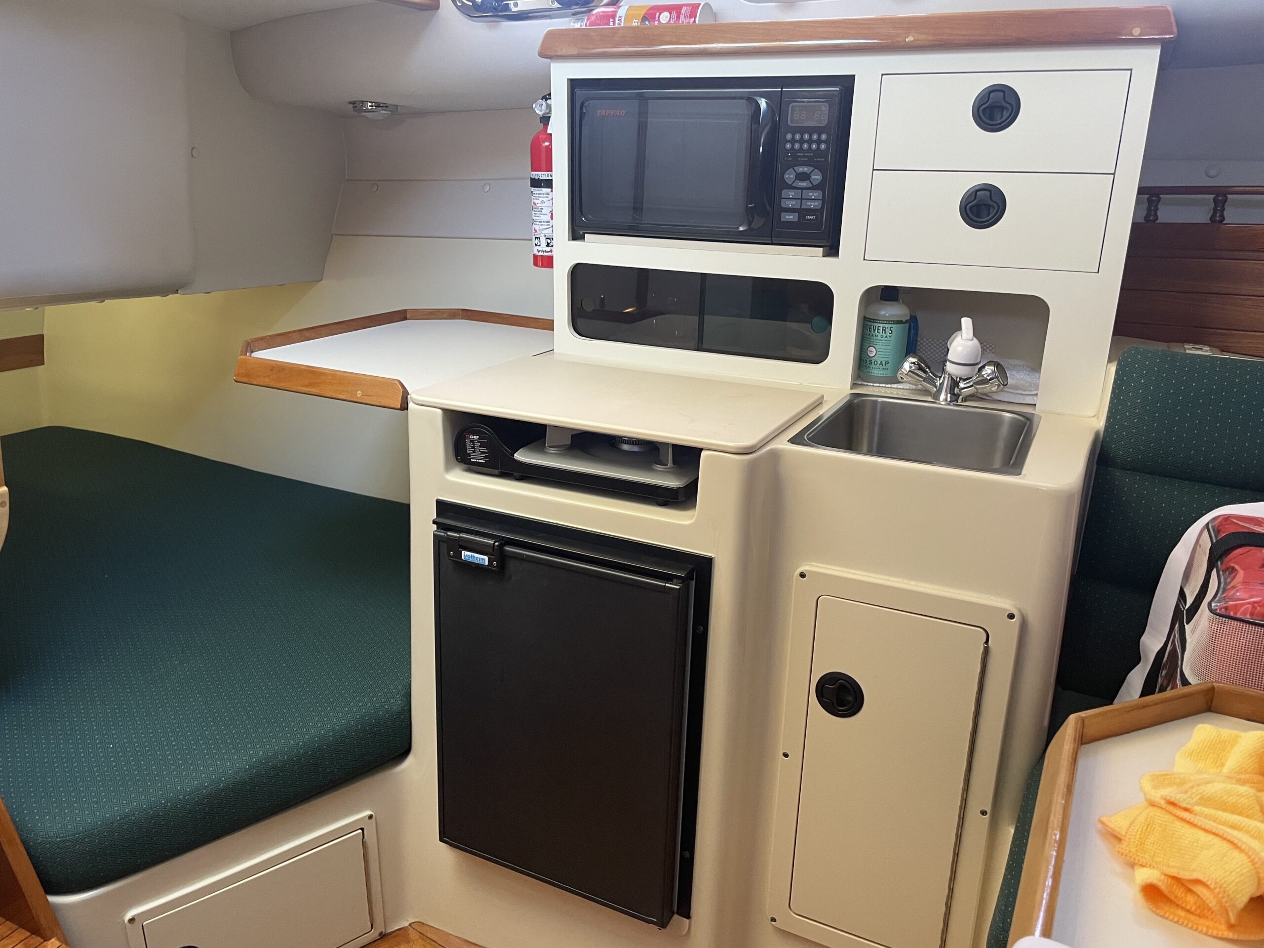full-service galley with fridge & microwave, stand-up head/shower, mid cabin berth aft & a convertible U-shaped dinette forward. Six opening ports provide good cabin ventilation.