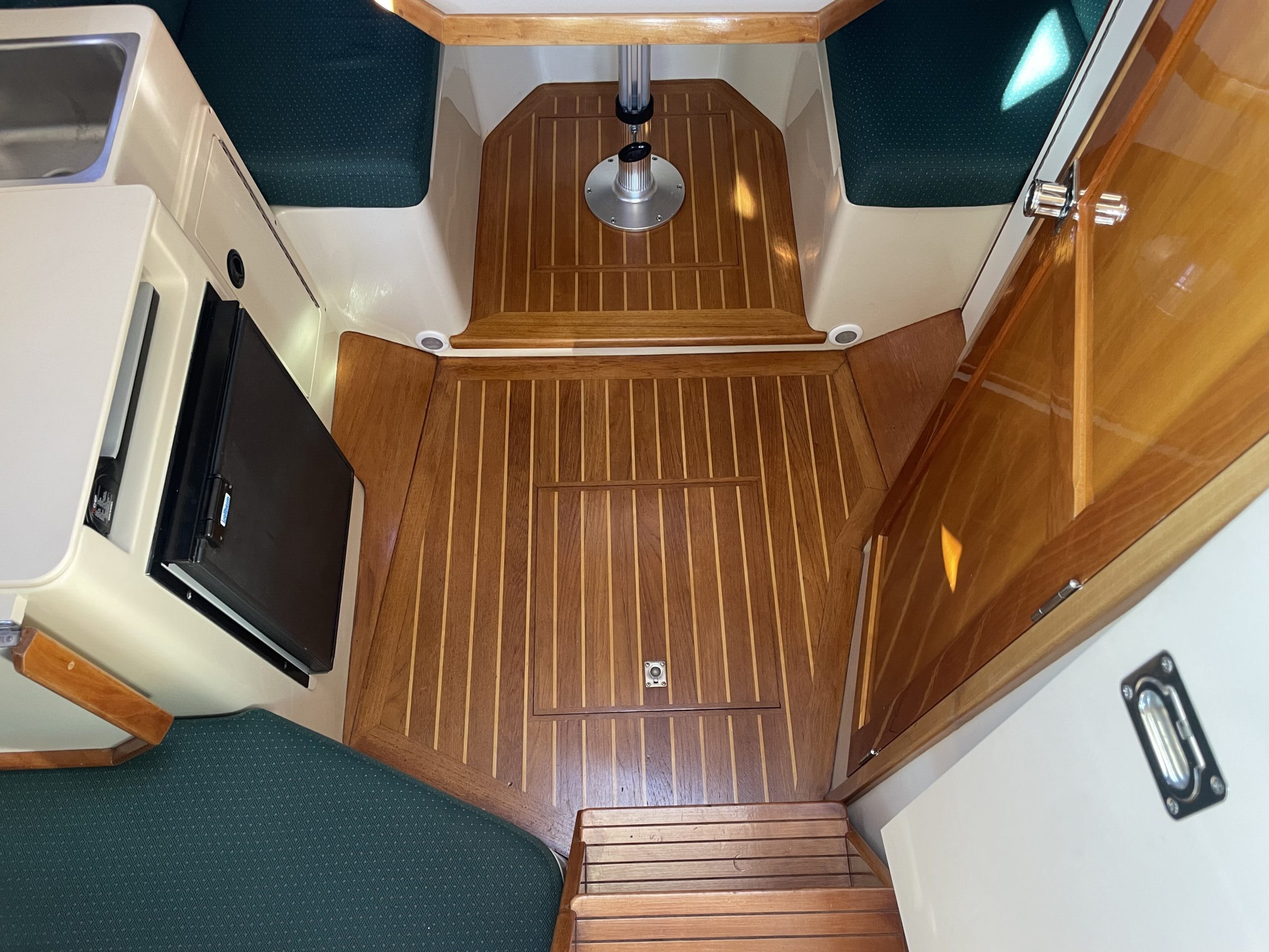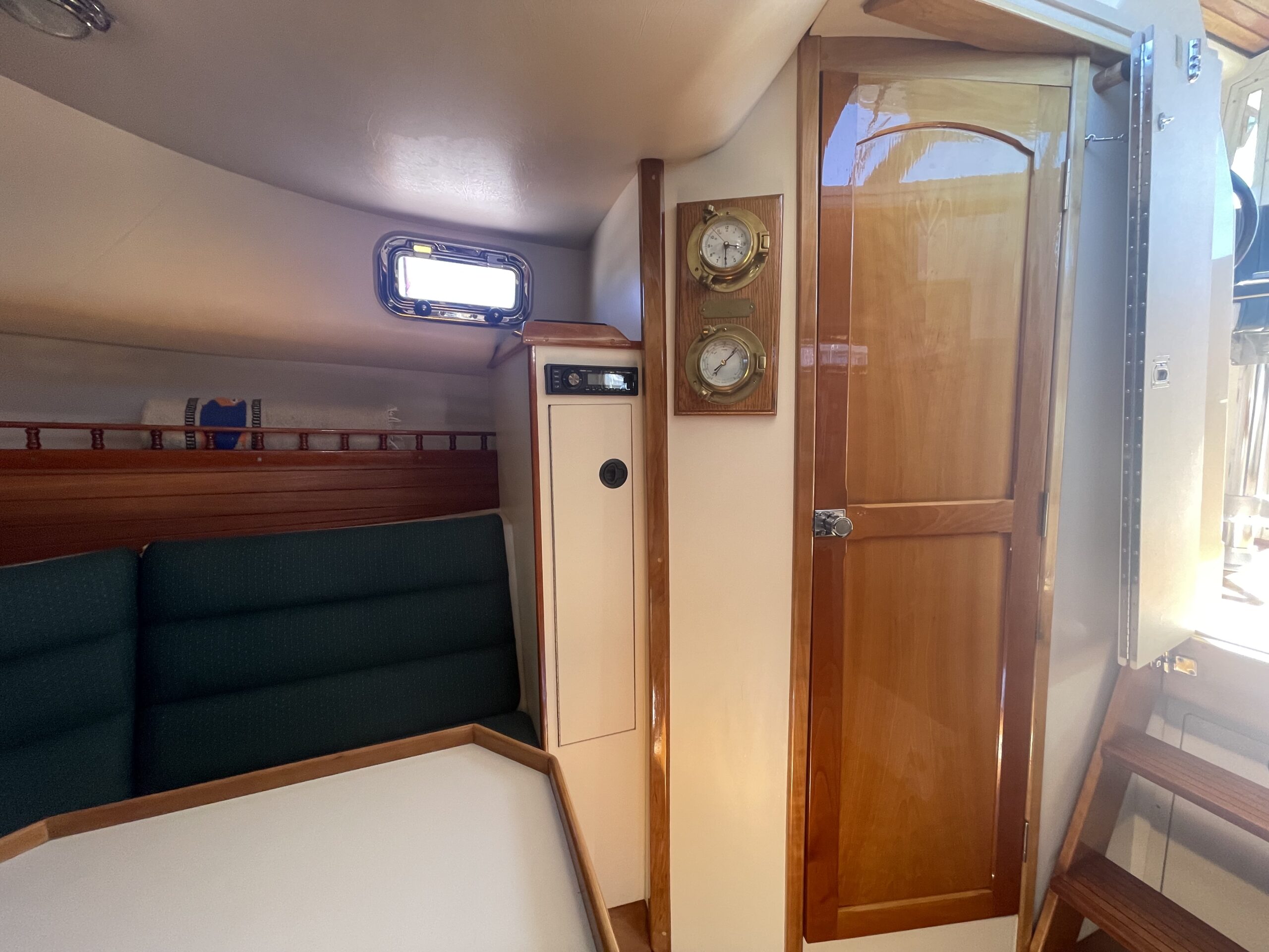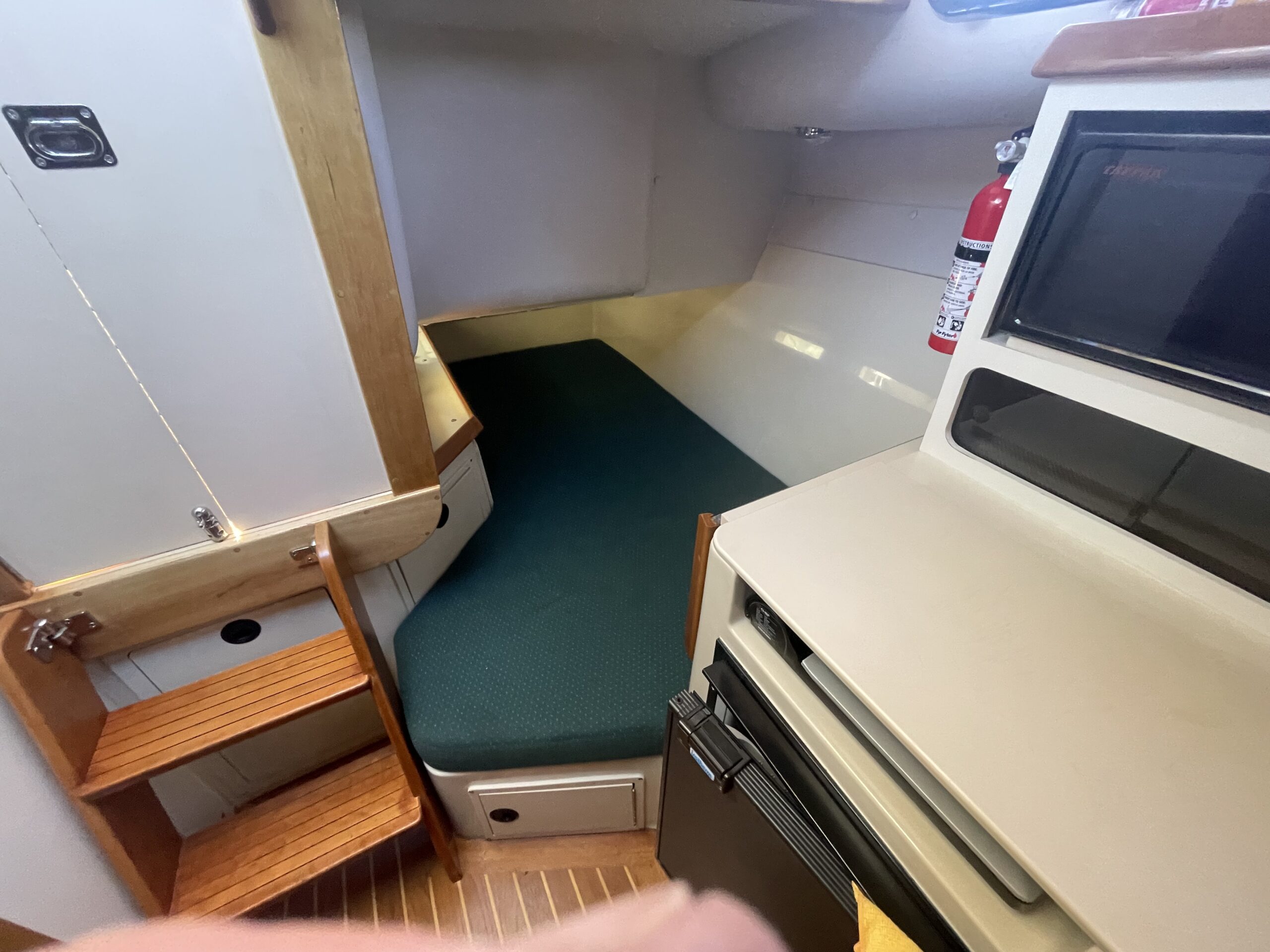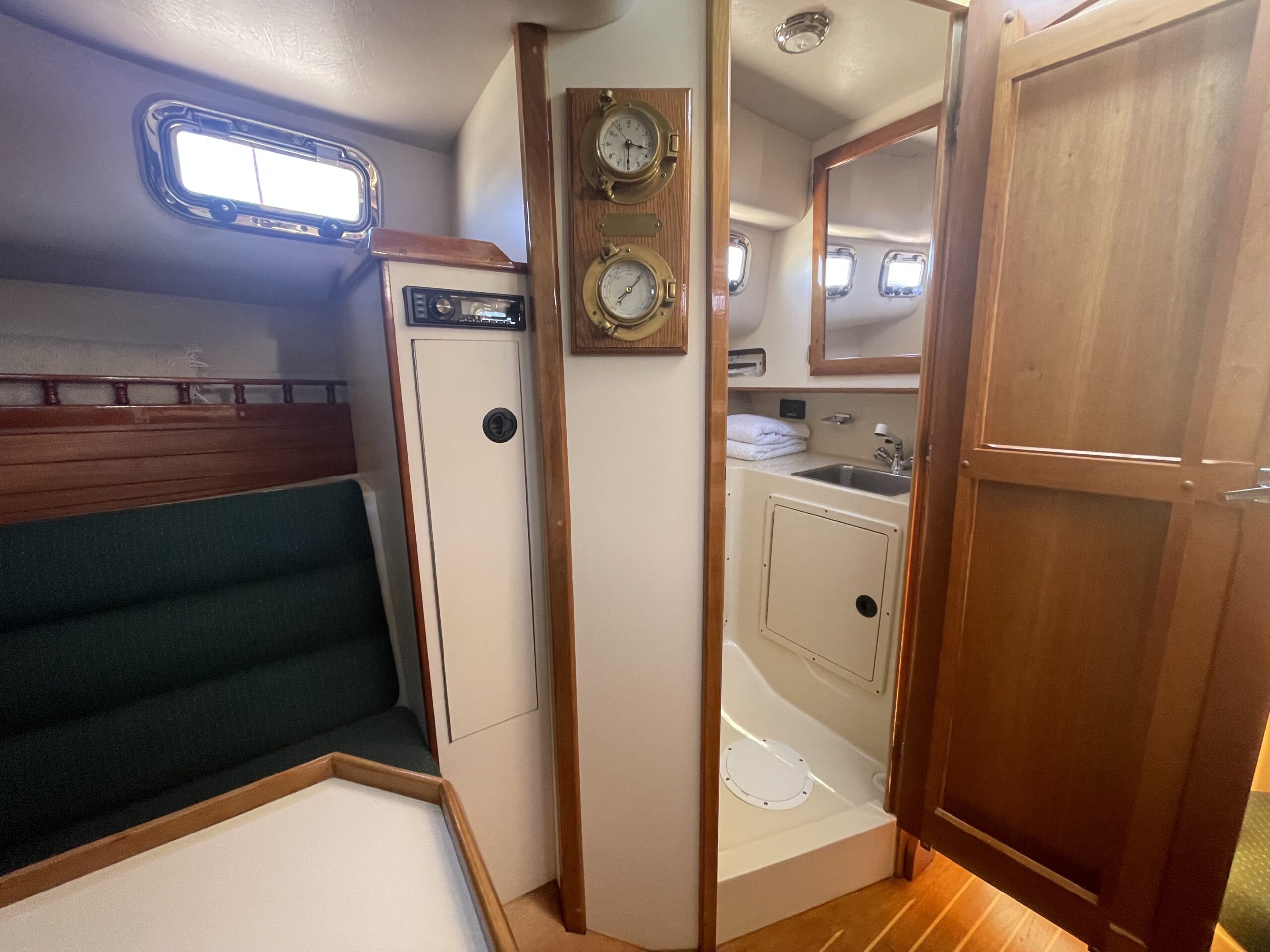 full-service galley with fridge & microwave, stand-up head/shower, mid cabin berth aft & a convertible U-shaped dinette forward. Six opening ports provide good cabin ventilation.