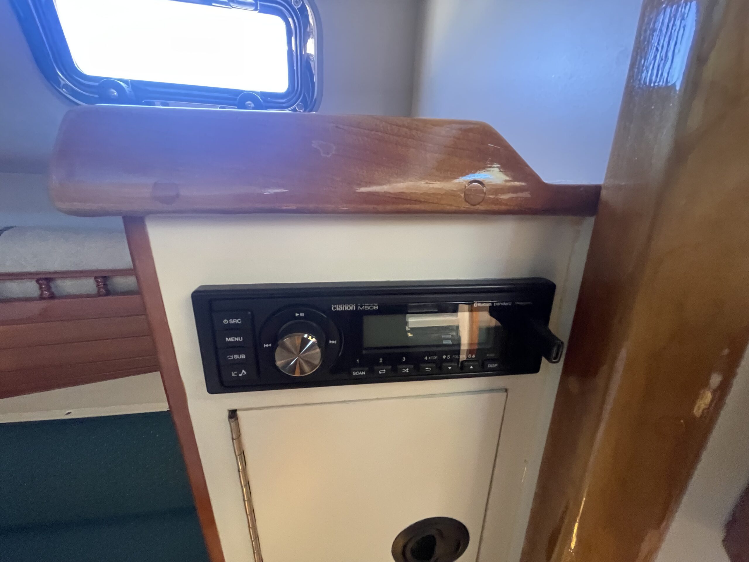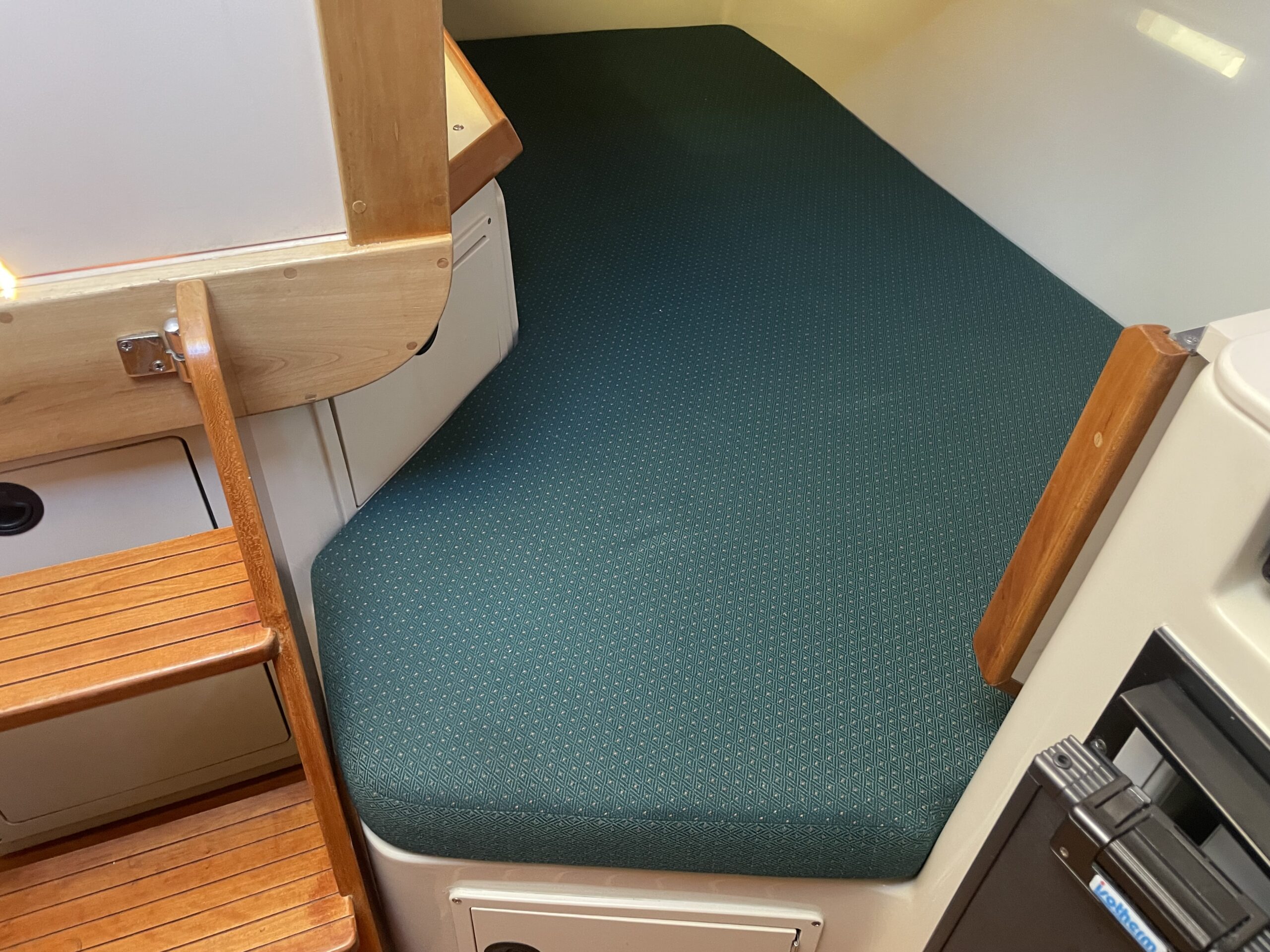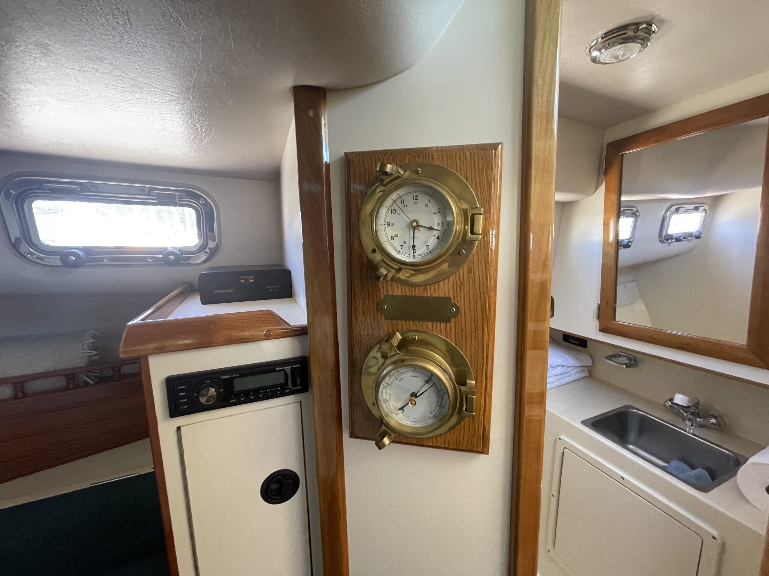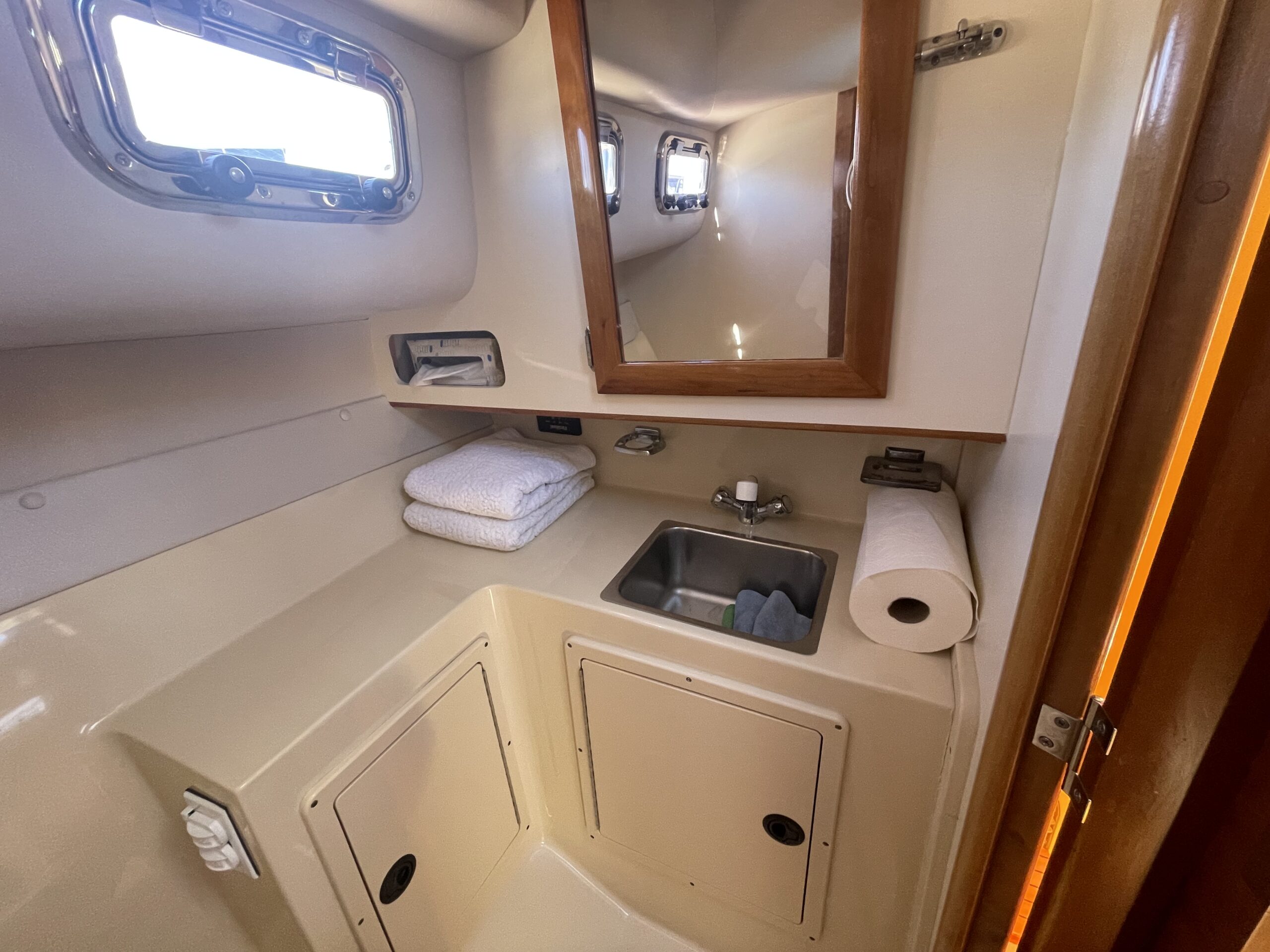full-service galley with fridge & microwave, stand-up head/shower, mid cabin berth aft & a convertible U-shaped dinette forward. Six opening ports provide good cabin ventilation.