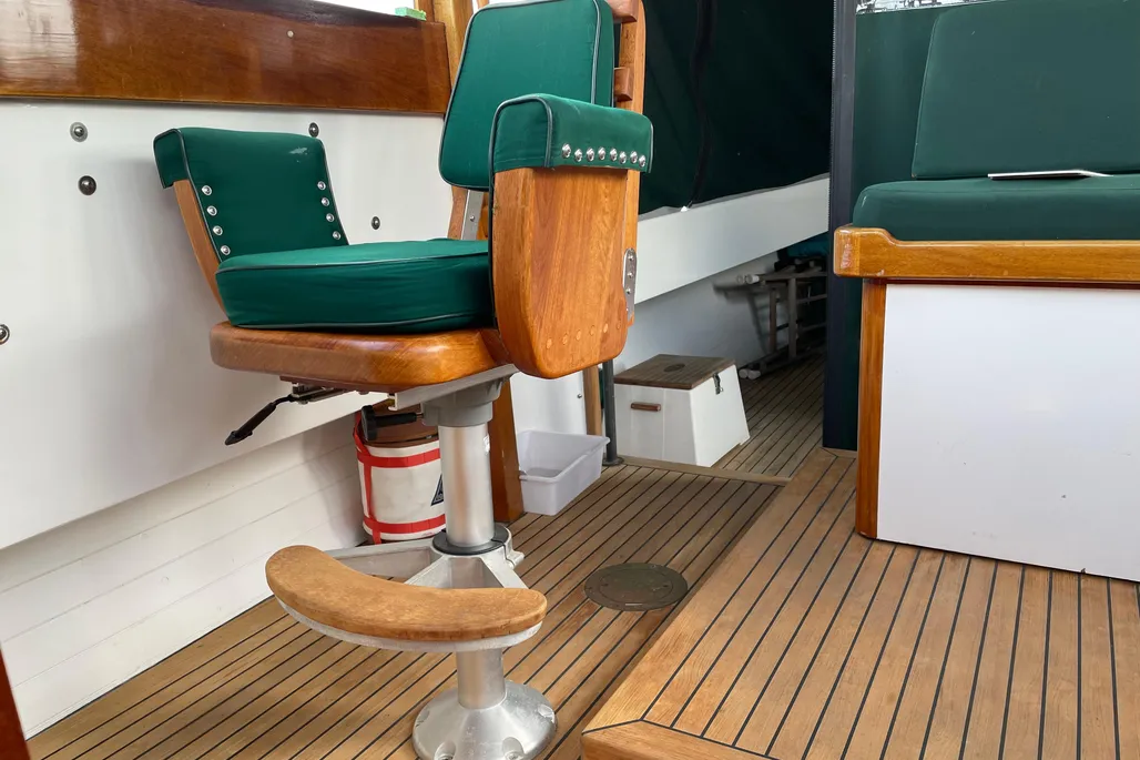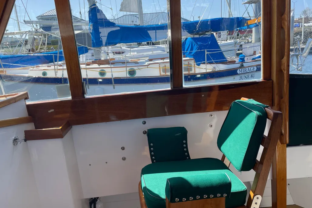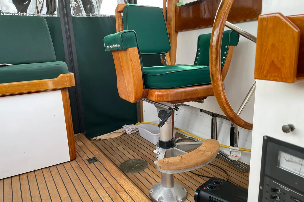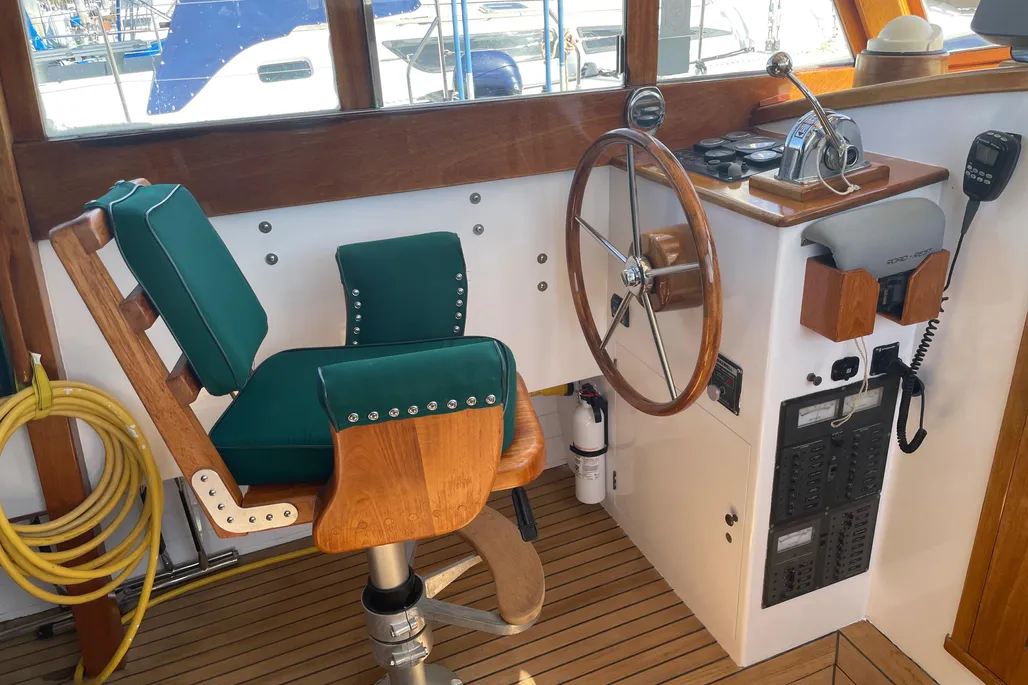LAYOUT: V-Berth forward followed by a galley to port and a large head to starboard. The wheelhouse features a helm to port and navigation to starboard with custom John Williams seats, slightly raised engine box at the center and excellent visibility. A huge 9′ cockpit is aft with a full width bench seat at the stern. The cockpit and wheelhouse are decked in teak and are self-bailing.