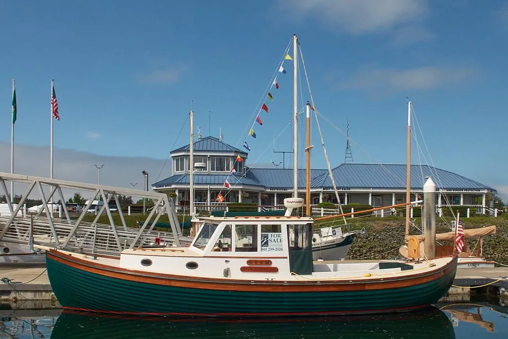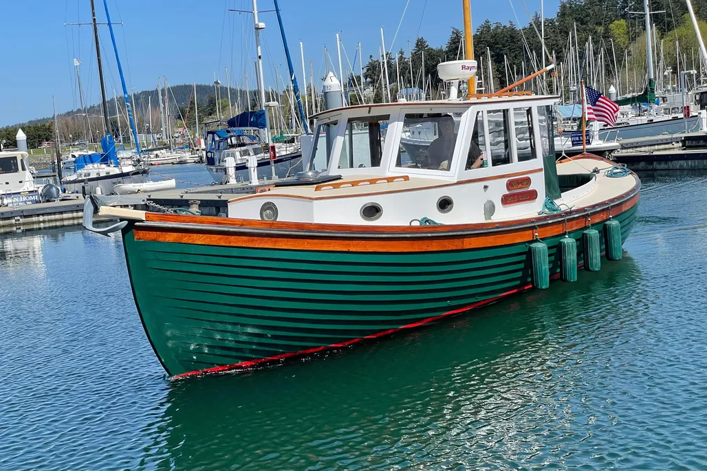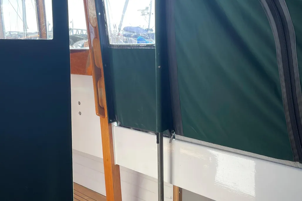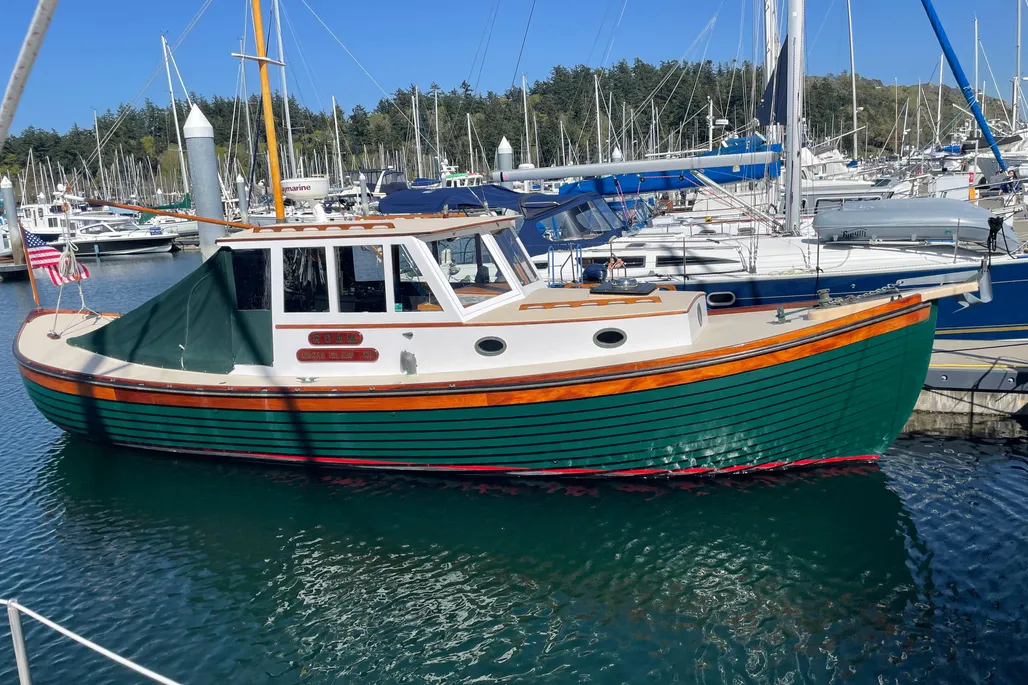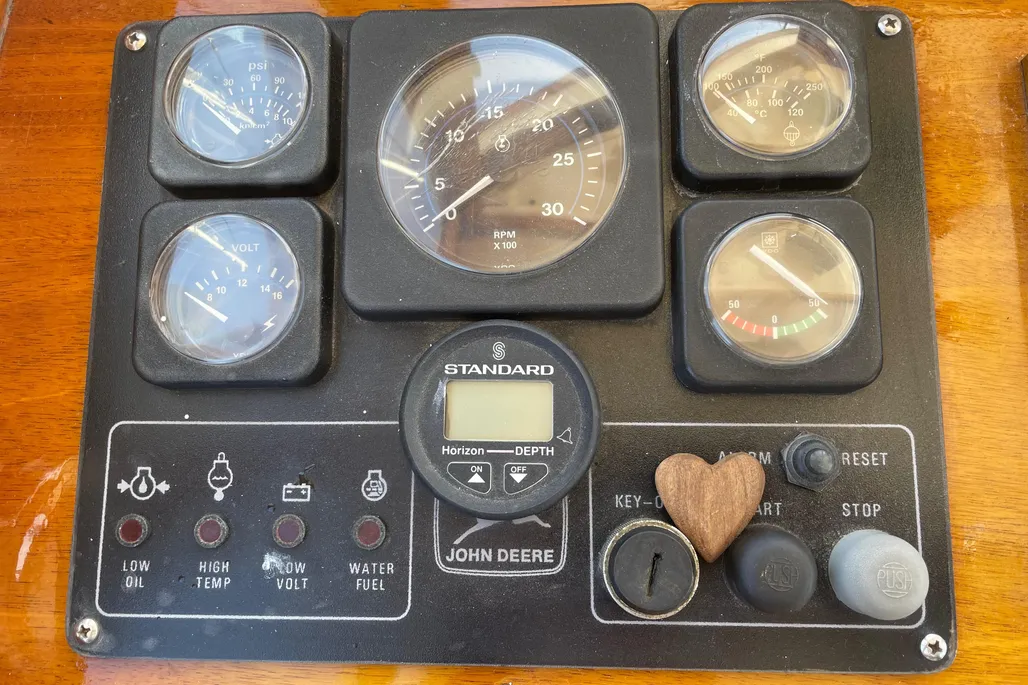 LAYOUT: V-Berth forward followed by a galley to port and a large head to starboard. The wheelhouse features a helm to port and navigation to starboard with custom John Williams seats, slightly raised engine box at the center and excellent visibility. A huge 9′ cockpit is aft with a full width bench seat at the stern. The cockpit and wheelhouse are decked in teak and are self-bailing.