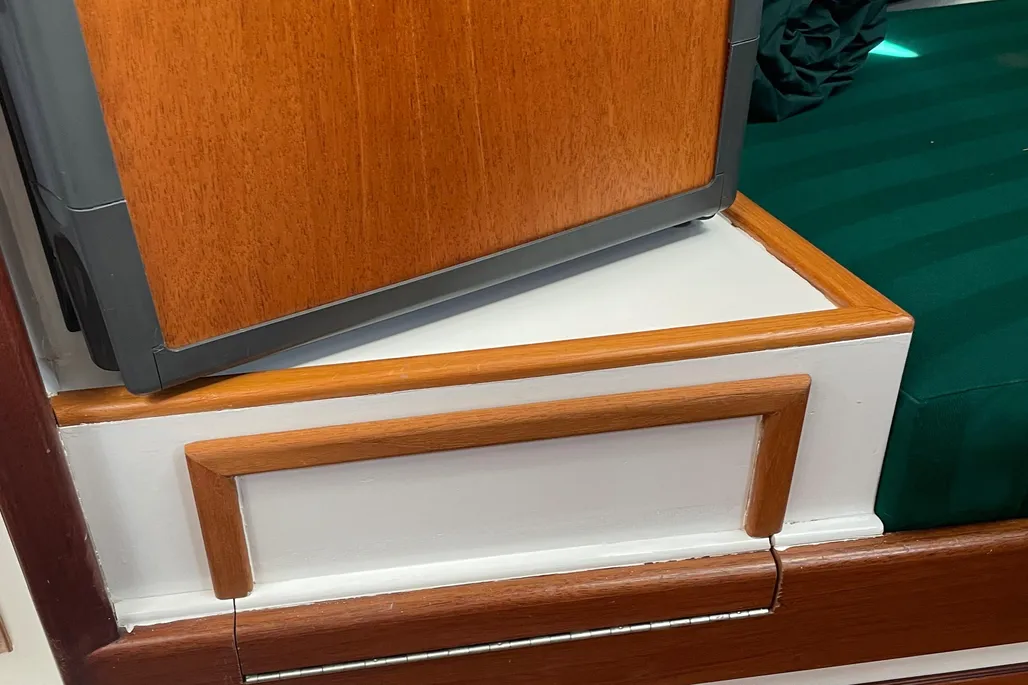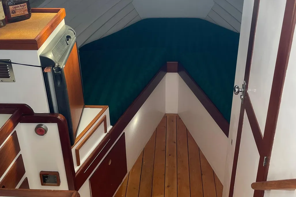 - Forward V-Berth: Sleeps 2 with two-tone green cushions