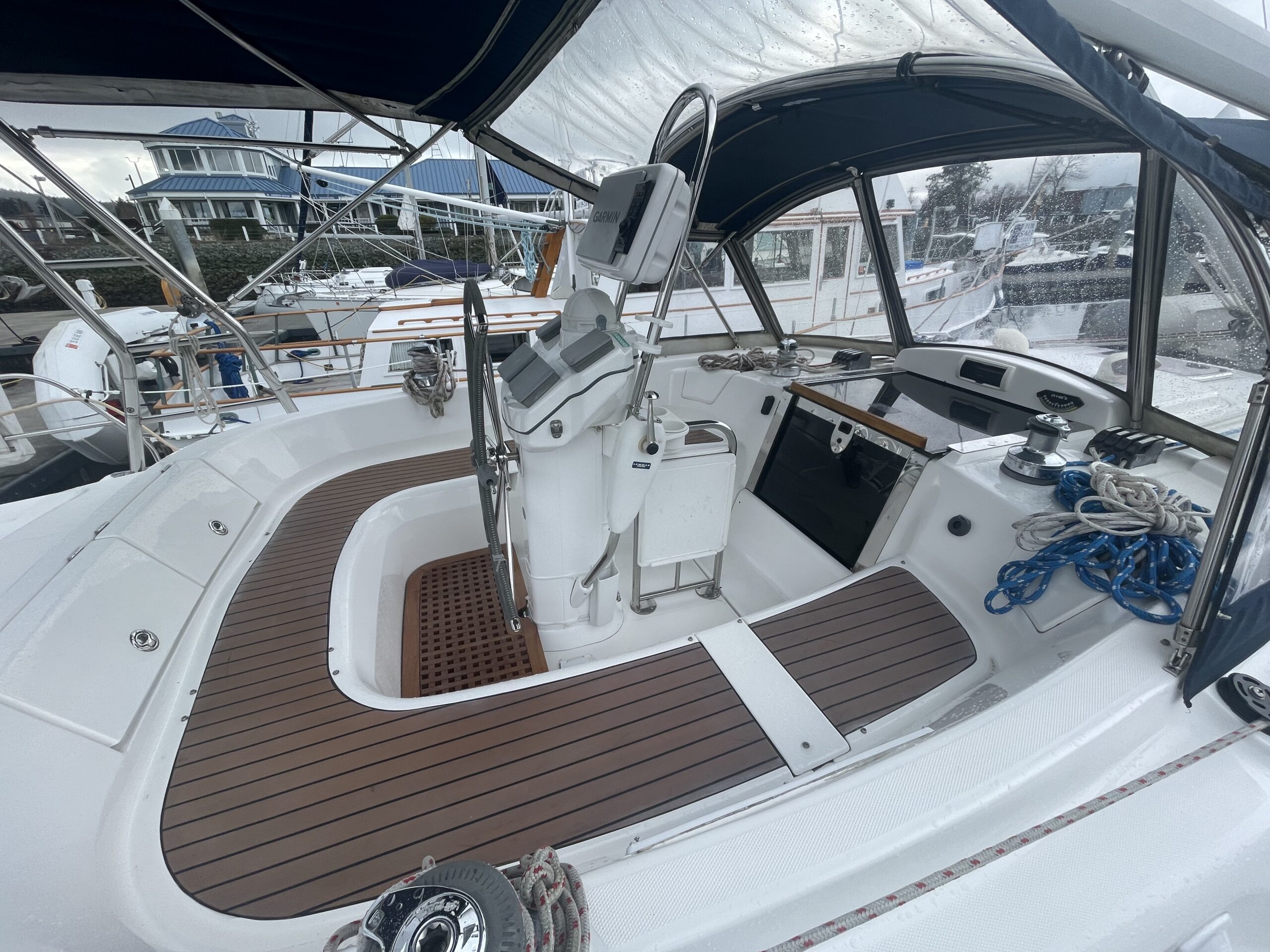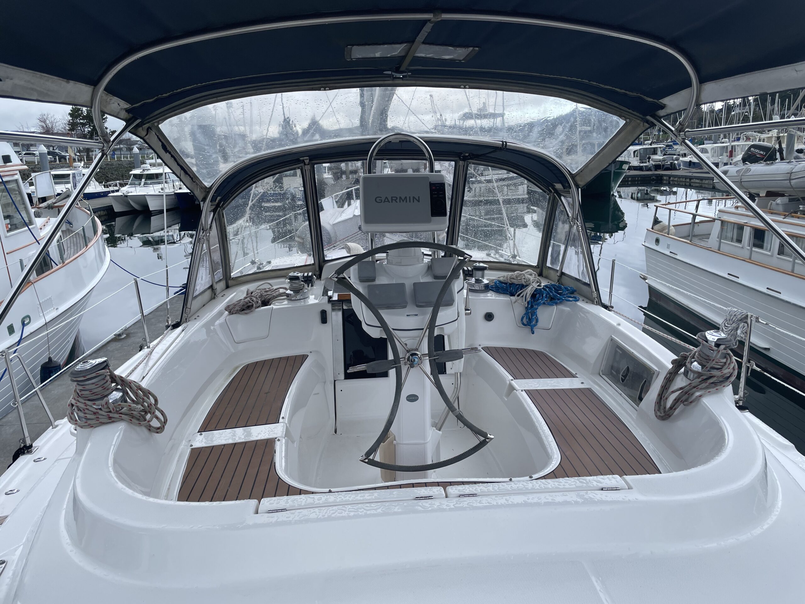 - Cockpit with Bench Seating, Pedestal Helm Wheel / Wide Side Decks Fore & Aft