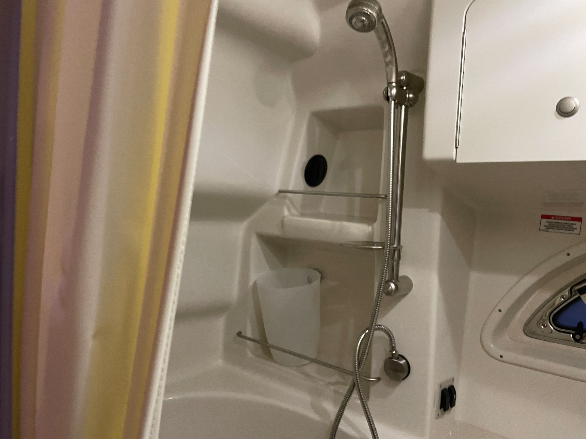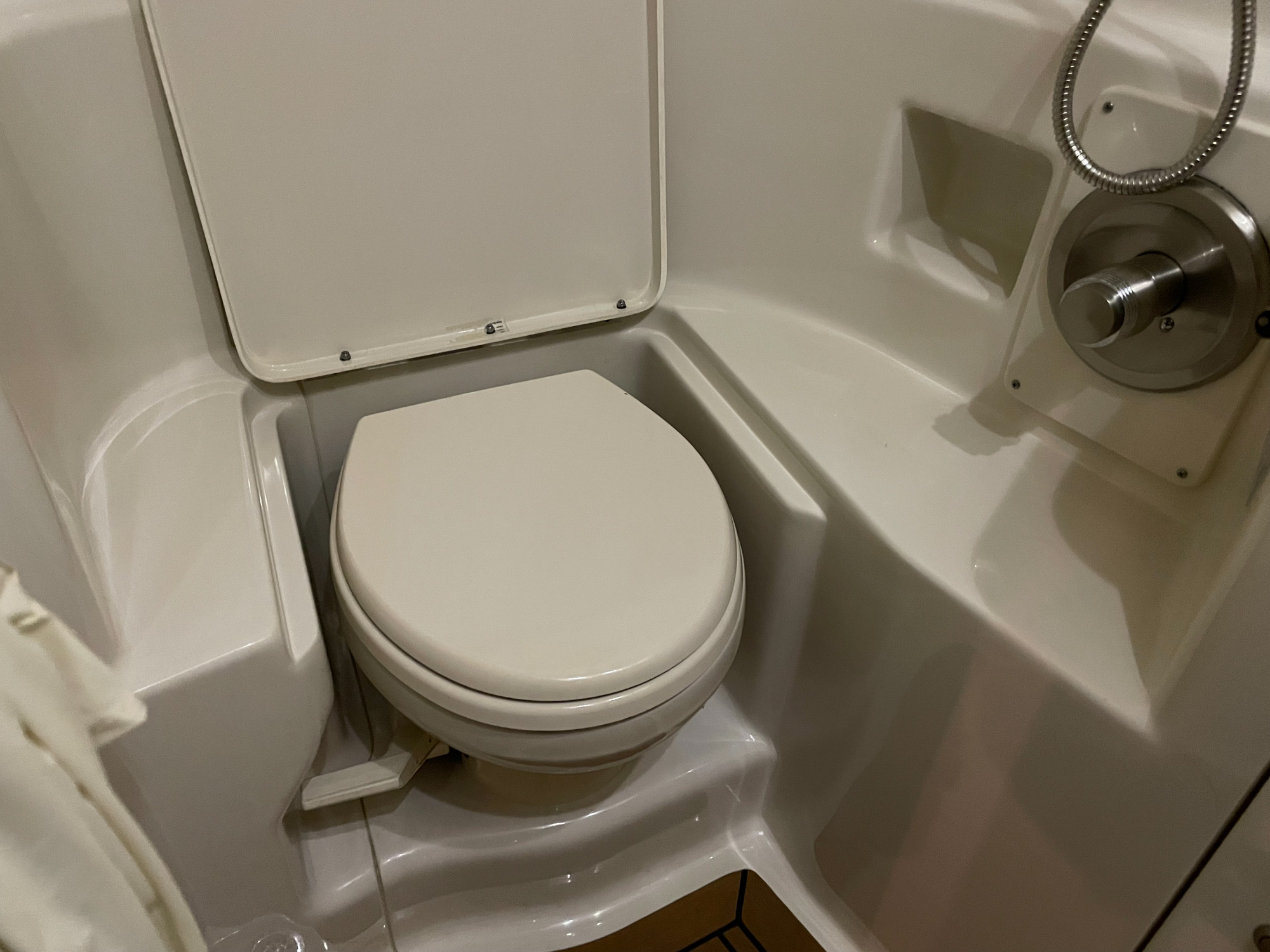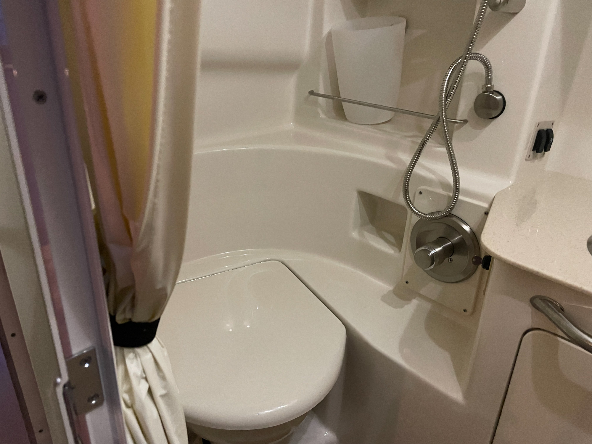 - Head: Fully enclosed private head with Vacu-Flush toilet, shower, macerator & deck pump-out
