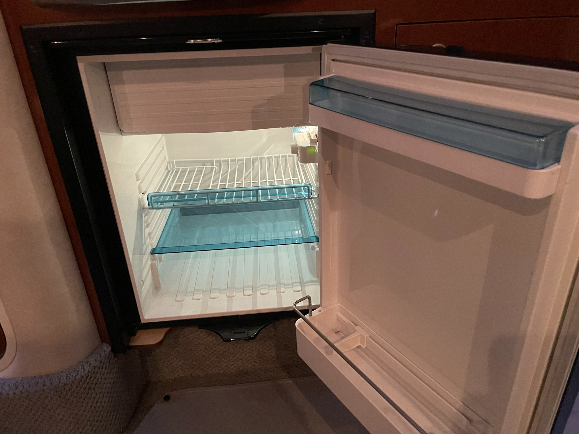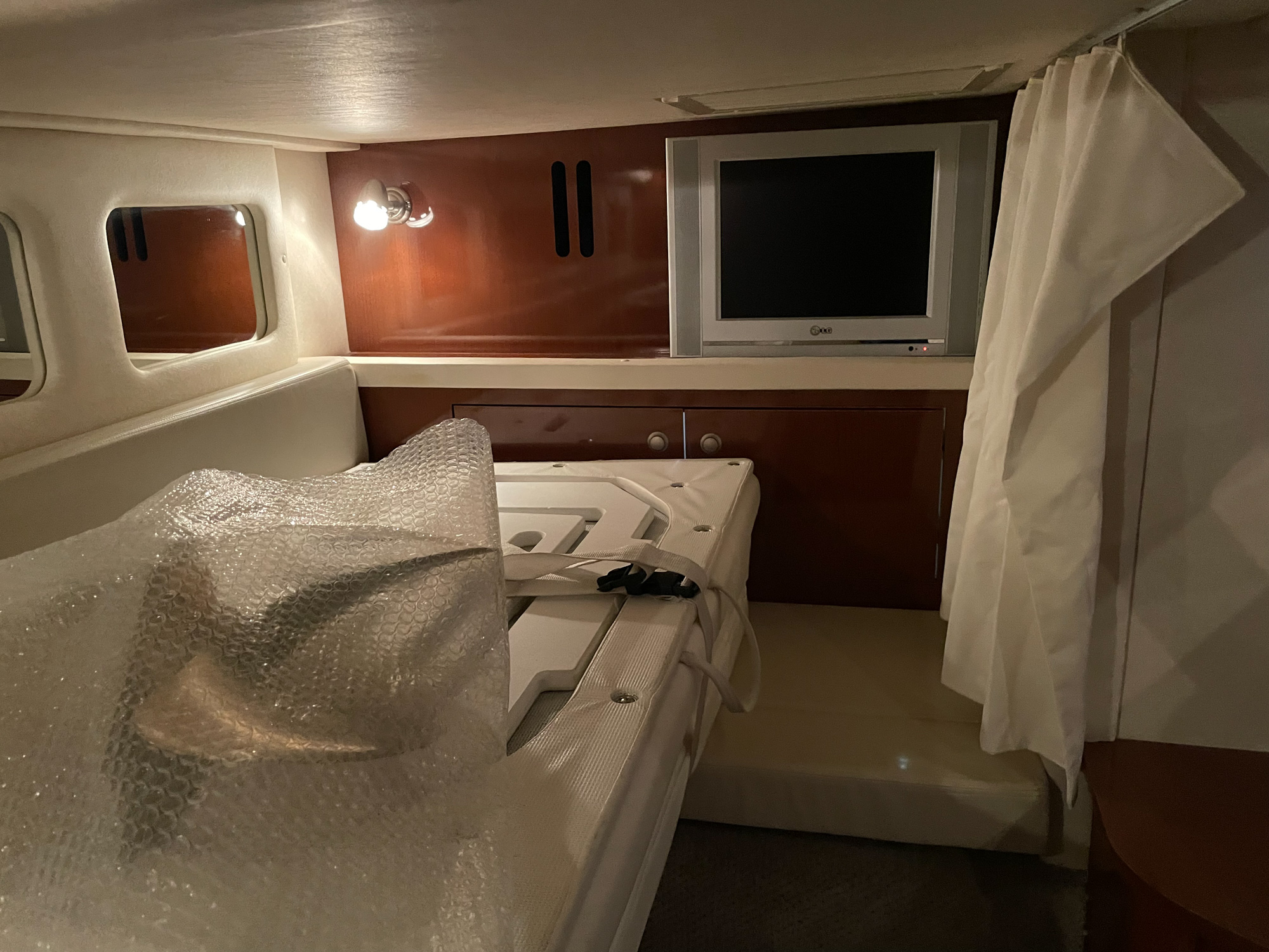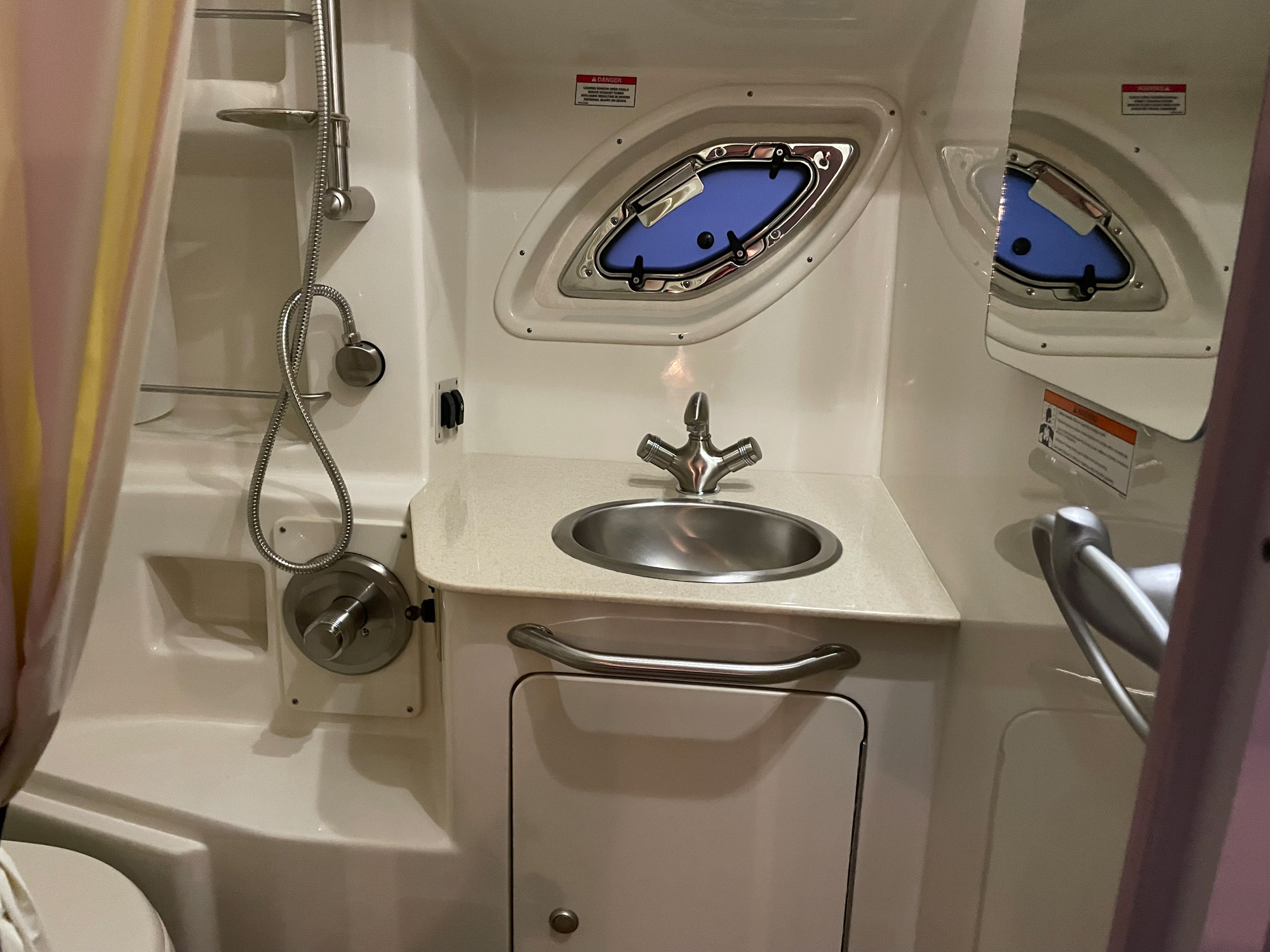 - Head: Fully enclosed private head with Vacu-Flush toilet, shower, macerator & deck pump-out