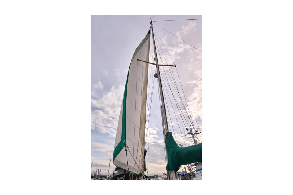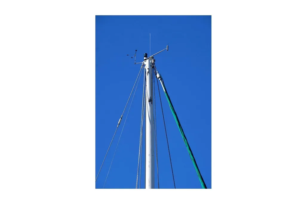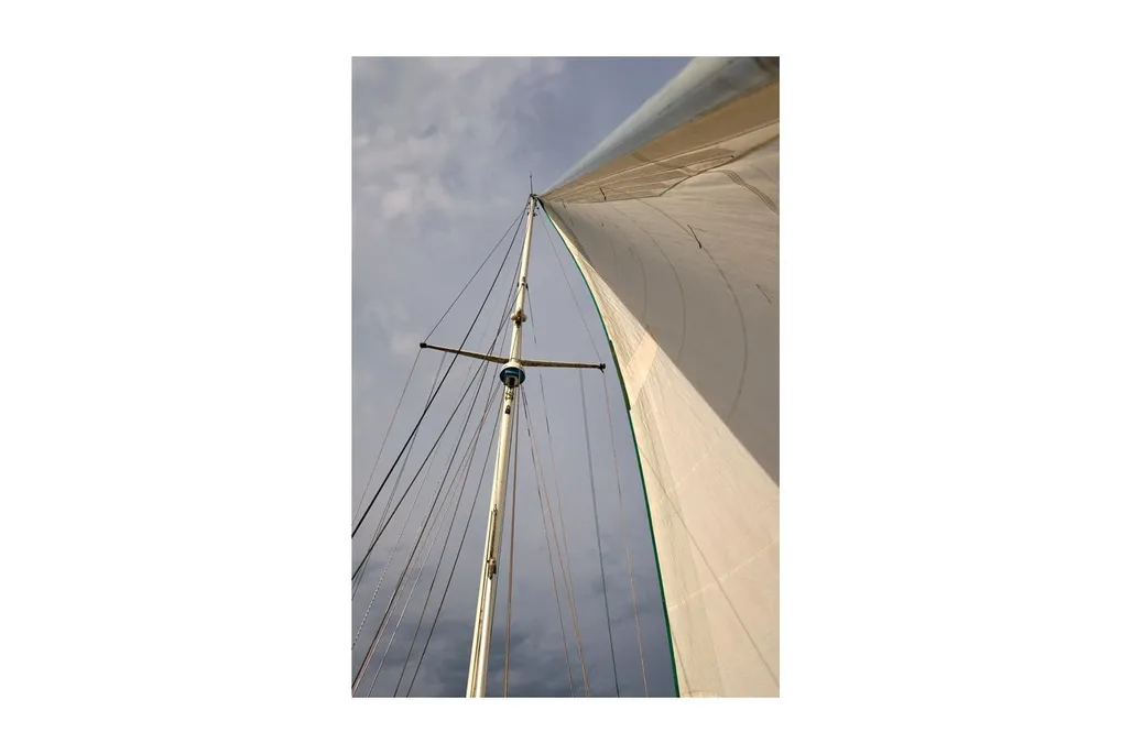 - Single-spreader, keel-stepped painted aluminum mast